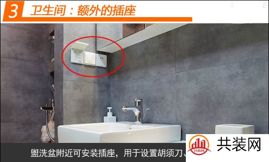 3、額外的插座 視住宅檔次或應(yīng)業(yè)主要求,還可在盥洗盆附近設(shè)置胡須刀插座及電動牙刷或帶隔離變壓器的插座。