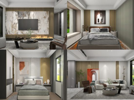 雅致清新背景墻 木紋:鳳眠蘇、黃粟柚、青杉木 純色:月牙白+布魯深灰 石紋:黑金花石、蜀白董石 清新的配色、體現(xiàn)品質(zhì)的家具,所有的一切都在描述家的概念。