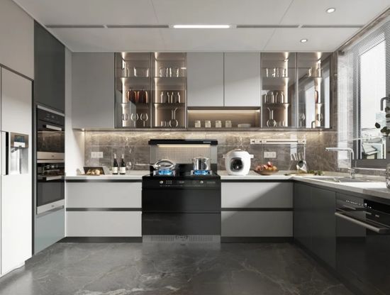 煥新裝廚房 LED24-R1+4平博美大板吊頂 廚房整體是“U”形設(shè)計,大板吊頂結(jié)合電器,完美隱藏,做飯動線非常流暢,環(huán)境整潔。