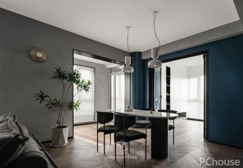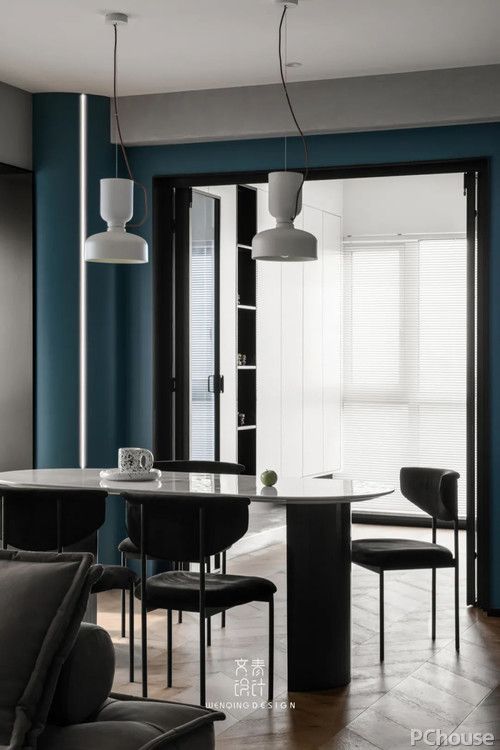 餐 廳 餐廳區(qū)域采用了深色的家具搭配粗曠的藝術(shù)涂料,以及厚重的湖藍(lán)色背景,這種質(zhì)感與色彩的碰撞,給人舒服又特別的味道,完全就是一場視覺盛宴。