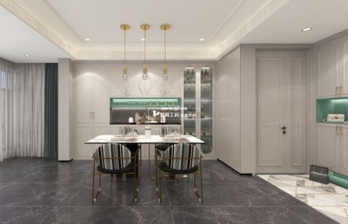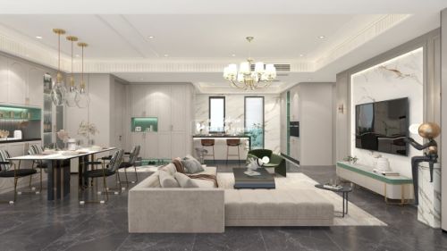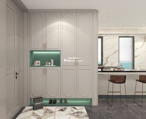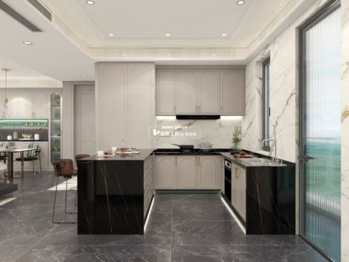 凹凸有型的膜壓工藝,門板線條細窄,輕盈靈巧;拱形結(jié)構(gòu),形式簡潔,幾何秩序渲染法式氛圍;晨曦灰與祖母綠、冰極藍、甘藍適度配比,色彩明暗交替,凝練優(yōu)雅姿態(tài),令人過目不忘;格柵、玻璃、石材、金屬等元素搭配,輕奢生活立顯,空間充滿探索和驚喜。