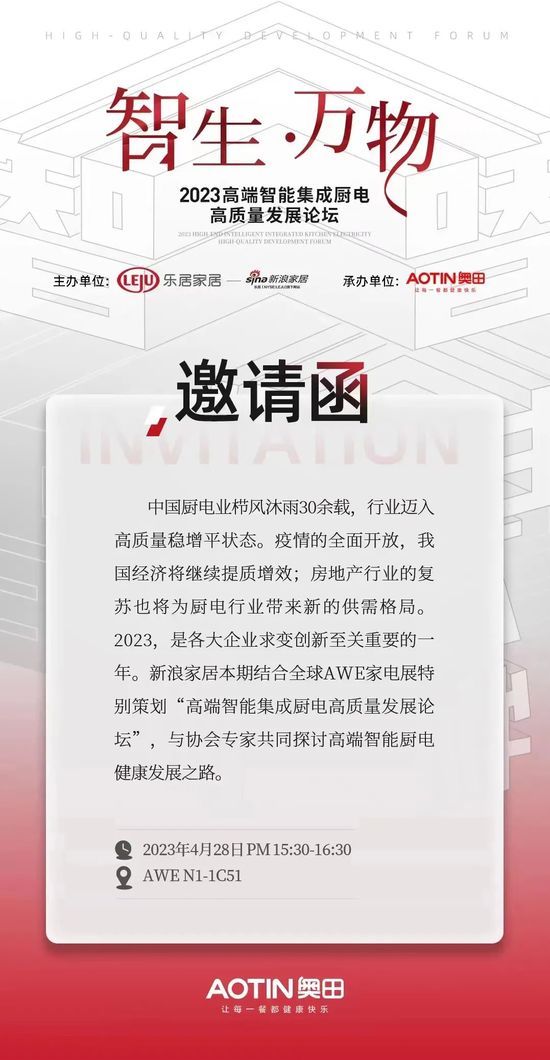 此次展會奧田還為大家?guī)砹司驶踊顒?,不間斷現(xiàn)場美食烹飪體驗;現(xiàn)場打卡分享白色集成灶,可獲得精美禮品更有機會贏千元大家,名額有限速速來打卡;4月28日下午3:30,聯(lián)合新浪家居,針對全球AWE家電展特別策劃“高端智能集成廚電高質量發(fā)展論壇”, 奧田N1-1C51恭候大家蒞臨~ 責任編輯:songyuying |