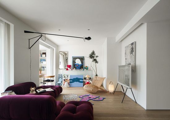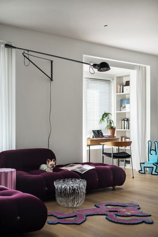 藝術(shù)在左,日常在右 當(dāng)代年輕人對(duì)潮流的追求從日常著裝逐漸侵入生活的方方面面,追求潮流似乎成為downtown青年的新興生活方式。在時(shí)尚領(lǐng)域,時(shí)裝的時(shí)效性成為衡量流行的標(biāo)準(zhǔn)。而在家居設(shè)計(jì)中,實(shí)用性和流行度需要平衡考慮、相輔相成。如何在家這個(gè)空間中營(yíng)造出新鮮感就是當(dāng)下設(shè)計(jì)師們的課題了。 在與柯沅伽的交流中,她特別談到家中的無(wú)過道設(shè)計(jì),將客廳打造成一個(gè)完整的空間,家就是她心境的完全寫照。110平米的空間里每一處都是她精心挑選的心愛之物??蛷d裝滿了自己喜歡的藝術(shù)品,家具和軟裝可以根據(jù)季節(jié)與心情隨意變化組合,任情緒自由流動(dòng),無(wú)拘無(wú)束。