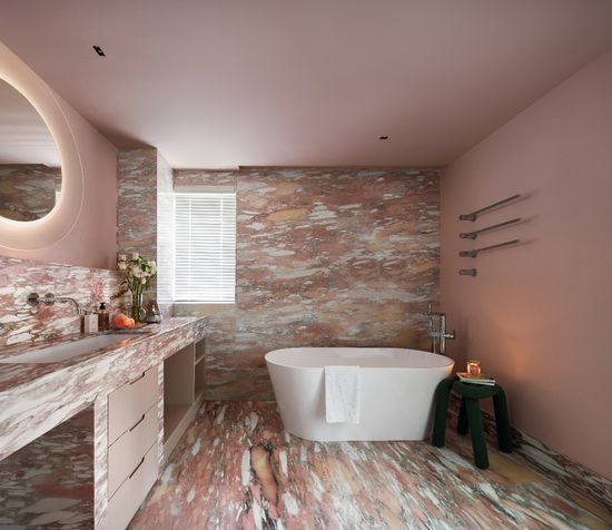 設(shè)計(jì)回歸需求 空間不被限制 “我喜歡在衛(wèi)生間喝咖啡。”柯沅伽語(yǔ)出驚人,但是當(dāng)你看到她的衛(wèi)浴間時(shí)便能完全理解。,這個(gè)以小眾大理石挪威紅和防水乳膠漆搭配打造的粉色獨(dú)立衛(wèi)浴空間,獨(dú)特而不張揚(yáng)、清爽又夢(mèng)幻。衛(wèi)生間秉持三分離功能特點(diǎn),不僅貌美,還兼具實(shí)用性。超寬的洗漱臺(tái)面可以安置她喜愛的各式香薰蠟燭與日常洗護(hù)用品。在獨(dú)享洗浴時(shí)能喝上一杯紅酒,泡澡時(shí)的閱讀都讓放松感油然而生。