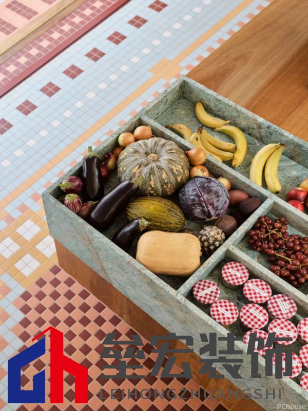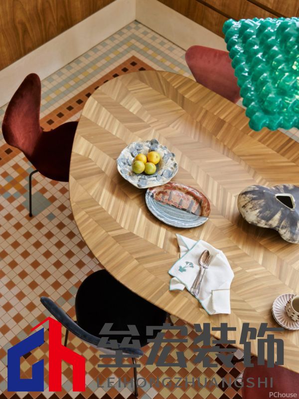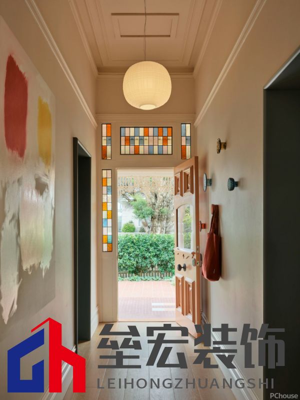 玄關是進入住宅的第一印象,也是這所房子風格的初步展示。入口處寶石色的鉛燈玻璃成為設計中的亮點,賦予空間一種濃郁的異國情調,并且將視覺線條引向后方擴建部分。瓷磚圖案借鑒了波斯地毯的設計,形成了一塊具有像素化效果的“地毯”,通過材料和圖案的創(chuàng)新將新舊空間連接起來,同時預示著房屋內其他區(qū)域豐富的幾何細節(jié)。