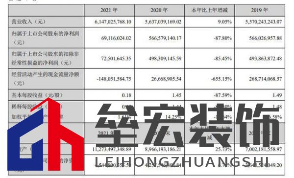 | 2022年4月30日,帝歐家居集團(tuán)股份有限公司(SZ002798,簡(jiǎn)稱:帝歐家居)發(fā)布2021年度業(yè)績(jī)報(bào)告。報(bào)告期內(nèi),帝歐家居實(shí)現(xiàn)營(yíng)業(yè)收入約61.47億元,同比增長(zhǎng)9.05%;歸屬于上市公司股東的凈利潤(rùn)約6912萬(wàn)元,同比下降87.80%;歸屬于上市公司股東的扣除非經(jīng)常性損益的凈利潤(rùn)約7250萬(wàn)元,同比下降85.45%;基本每股收益0.18元/股,同比下降87.59%。