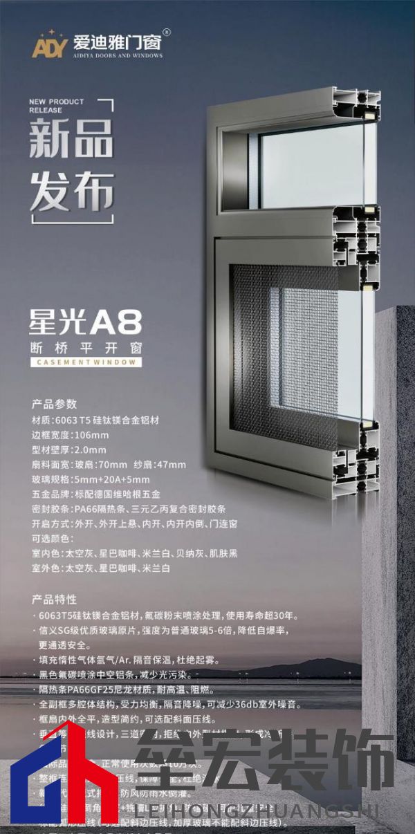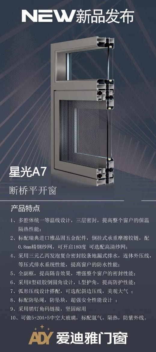 星光A7斷橋窗紗一體平開窗,邊框采用幕墻式結(jié)構(gòu),外形美觀,并且室外的那一面不易積塵,積水,長年以來易打理,清潔干凈。窗扇采用304不銹鋼摩擦鉸鏈,裝配0.8mm不銹鋼金剛紗,配備質(zhì)量優(yōu),使用久了不易磨損。這款產(chǎn)品時尚大氣,適合高端家裝市場。 榮耀V6斷橋平開窗,內(nèi)外平框,隱藏排水功能,其中設定科學水流路徑,雨天排水更加順暢,避免堵塞。設有高強度防護欄,由高密度鈦鎂鋁合金打造,既能防盜又能防護,保護家人安全。造型獨特,美觀大氣,整個空間都會顯得很寬敞,將自然美景收入家中。
