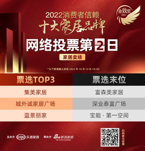 | 由樂居家居主辦,新浪家居承辦;CCTV《大國品牌》、家頁、家居質(zhì)量研究院、大國中居聯(lián)合主辦;全國工商聯(lián)家具裝飾業(yè)商會、中國建筑材料流通協(xié)會共同指導(dǎo);樂騰商學(xué)院、家頁智庫、家居質(zhì)量研究院提供研究支持。9月16日,第三屆《尋找優(yōu)質(zhì)消費者品牌--2022消費者信賴十大家居品牌》正式啟動。經(jīng)過企業(yè)申報、候選品牌公示環(huán)節(jié)后,于10月12日正式進入投票環(huán)節(jié)。>>點擊為家居賣場品牌投票 家居賣場第二日戰(zhàn)報如下