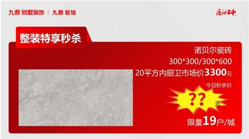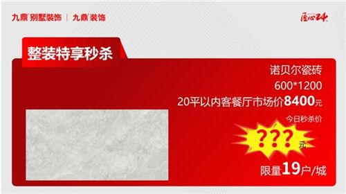 諾貝爾瓷磚,600*1200,20平方以內(nèi)客餐廳市場價8400元,今日秒殺價???元(限量19戶/城)