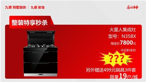 火星人集成灶,型號:N35BX,淘寶價7800元,今日秒殺價???元,另外贈送499元鍋3件套(限量版19戶/城)