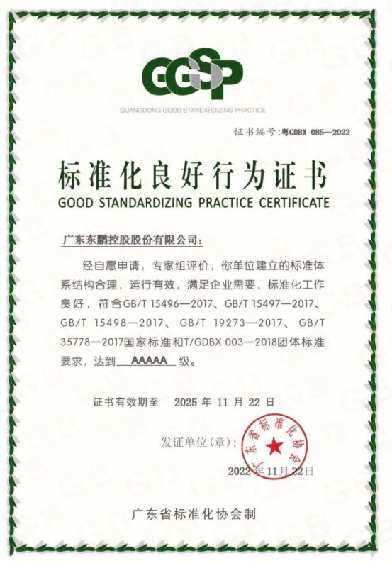 | ??11月22日,廣東省標(biāo)準(zhǔn)化協(xié)會組織專家組對廣東東鵬控股股份有限公司的企業(yè)標(biāo)準(zhǔn)化工作進(jìn)行評價確認(rèn),依據(jù)評價準(zhǔn)則最終評為“標(biāo)準(zhǔn)化良好行為”AAAAA級企業(yè)。 ??企業(yè)標(biāo)準(zhǔn)化良好行為是指企業(yè)依據(jù)《企業(yè)標(biāo)準(zhǔn)體系》系列國家標(biāo)準(zhǔn)(GB/T 15496—2017、GB/T 15497—2017、GB/T 15498—2017、GB/T 19273—2017、GB/T 35778—2017)和廣東省標(biāo)準(zhǔn)化協(xié)會團(tuán)體標(biāo)準(zhǔn)T/GDBX 003—2018等標(biāo)準(zhǔn)要求,開展企業(yè)標(biāo)準(zhǔn)化工作,建立全新的企業(yè)標(biāo)準(zhǔn)體系并有效運(yùn)行,保證企業(yè)各項活動有序開展并取得良好經(jīng)濟(jì)和社會效益。