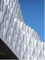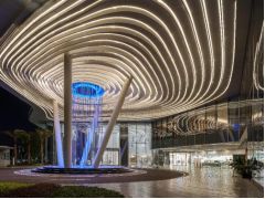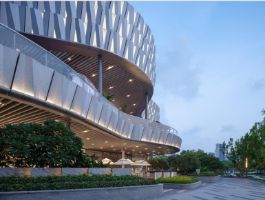 珠海環(huán)宇城的外立面以多層次的波浪紋呼應(yīng)海洋主題 裙樓設(shè)計(jì)以海洋作為靈感,與帆船形態(tài)的塔樓設(shè)計(jì)相呼應(yīng)。波紋折板、浪花型的穿孔鋁板等飾面配合簡潔流暢的線條突出現(xiàn)代輕奢感。入口以海浪元素為設(shè)計(jì)靈感,臨河一面的圓弧形線條宛如層層疊疊的波紋,加上造型各異的頂棚,讓人有種踏入海浪的互動(dòng)感。夜幕降臨后,在燈光的烘托下,人們仿佛沉浸于寧靜而斑斕的海洋世界。