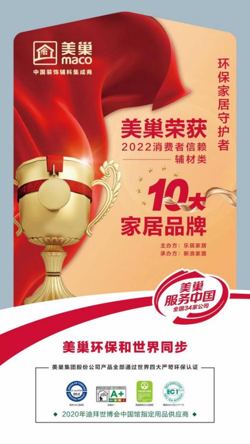 ??“2022消費(fèi)者信賴十大家居品牌”評(píng)選活動(dòng)由樂(lè)居家居主辦,新浪家居承辦,CCTV《大國(guó)品牌》、家頁(yè)、家居質(zhì)量研究院、大國(guó)中居聯(lián)合主辦。本次評(píng)選活動(dòng)以“家居行業(yè)高質(zhì)量發(fā)展,扎實(shí)推進(jìn)優(yōu)質(zhì)品牌建設(shè)”為宗旨,通過(guò)對(duì)產(chǎn)品品質(zhì)、服務(wù)質(zhì)量、消費(fèi)口碑、品牌影響力四大維度綜合評(píng)審。美巢憑借世界水平的環(huán)保產(chǎn)品、美巢服務(wù)中國(guó)的市場(chǎng)布局、良好的消費(fèi)者口碑及深耕多年的品牌影響力榮登“2022消費(fèi)者信賴十大家居品牌”輔材類(lèi)榜單。 ??環(huán)保家居守護(hù)者,美巢環(huán)保和世界同步 ??作為消費(fèi)者信賴十大家居品牌,美巢成立26年以來(lái)始終專(zhuān)注、專(zhuān)業(yè)于室內(nèi)環(huán)保裝飾輔料的研究、開(kāi)發(fā)和制造。室內(nèi)裝飾與生命零距離,美巢有責(zé)任給消費(fèi)者一個(gè)鄭重承諾——“美巢環(huán)保和世界同步”。美巢集團(tuán)股份公司產(chǎn)品全部通過(guò)了世界四大環(huán)保認(rèn)證:美國(guó)UL GREENGUARD綠色衛(wèi)士[金級(jí)]認(rèn)證、德國(guó)GEV EMICODE EC1PLUS認(rèn)證、歐洲歐陸IAC金級(jí)認(rèn)證、法國(guó)French A+級(jí)標(biāo)準(zhǔn)。憑借著世界水平的環(huán)保產(chǎn)品被授牌成為2020年迪拜世博會(huì)中國(guó)館指定用品供應(yīng)商。