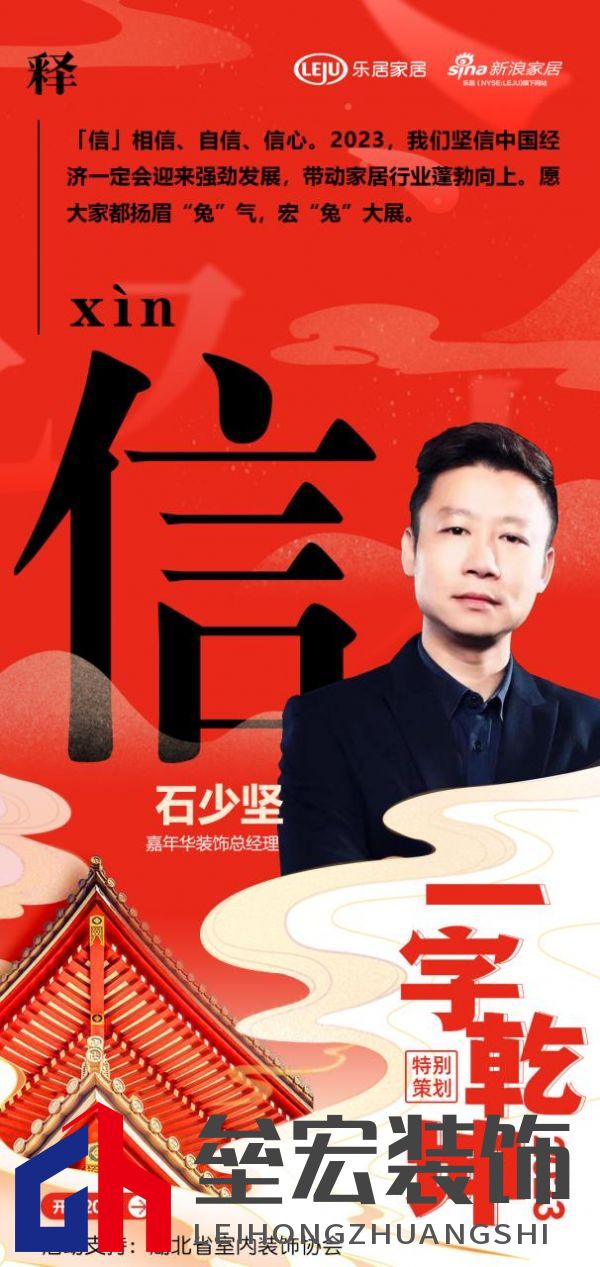 在新浪家居“2023一字乾坤”活動(dòng)中,嘉年華裝飾總經(jīng)理石少堅(jiān):「信」相信、自信、信心。2023,我們堅(jiān)信中國(guó)經(jīng)濟(jì)一定會(huì)迎來(lái)強(qiáng)勁發(fā)展,帶動(dòng)家居行業(yè)蓬勃向上。愿大家都揚(yáng)眉“兔”氣,宏“兔”大展。 “以漢字賦能湖北家居企業(yè),彰顯厚積薄發(fā)之力”,以單字抒寫了各家企業(yè)及媒體的新年愿景與發(fā)展信條,領(lǐng)略楚風(fēng)漢韻下湖北家居人砥礪向前,揚(yáng)帆未來(lái)的決心與動(dòng)力,情暖兔歲,新啟華章。 |