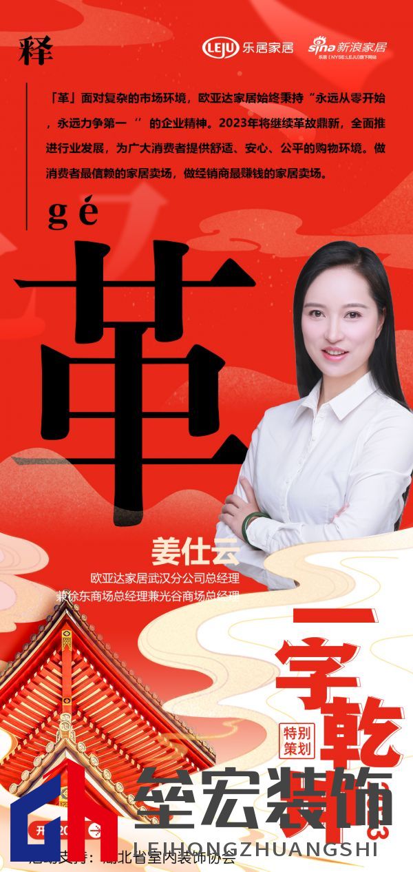 在新浪家居“2023一字乾坤”活動(dòng)中,歐亞達(dá)家居武漢分公司總經(jīng)理兼徐東商場(chǎng)總經(jīng)理兼光谷商場(chǎng)總經(jīng)理姜仕云:「革」去故也。鼎,取新也。面對(duì)復(fù)雜的市場(chǎng)環(huán)境,歐亞達(dá)家居始終秉持“永遠(yuǎn)從零開(kāi)始,永遠(yuǎn)力爭(zhēng)第一”的企業(yè)精神。2023年將繼續(xù)革故鼎新,全面推進(jìn)行業(yè)發(fā)展,為廣大消費(fèi)者提供舒適、安心、公平的購(gòu)物環(huán)境。做消費(fèi)者最信賴的家居賣場(chǎng),做經(jīng)銷商最賺錢(qián)的家居賣場(chǎng)。 “以漢字賦能湖北家居企業(yè),彰顯厚積薄發(fā)之力”,以單字抒寫(xiě)了各家企業(yè)及媒體的新年愿景與發(fā)展信條,領(lǐng)略楚風(fēng)漢韻下湖北家居人砥礪向前,揚(yáng)帆未來(lái)的決心與動(dòng)力,情暖兔歲,新啟華章。 |