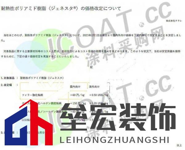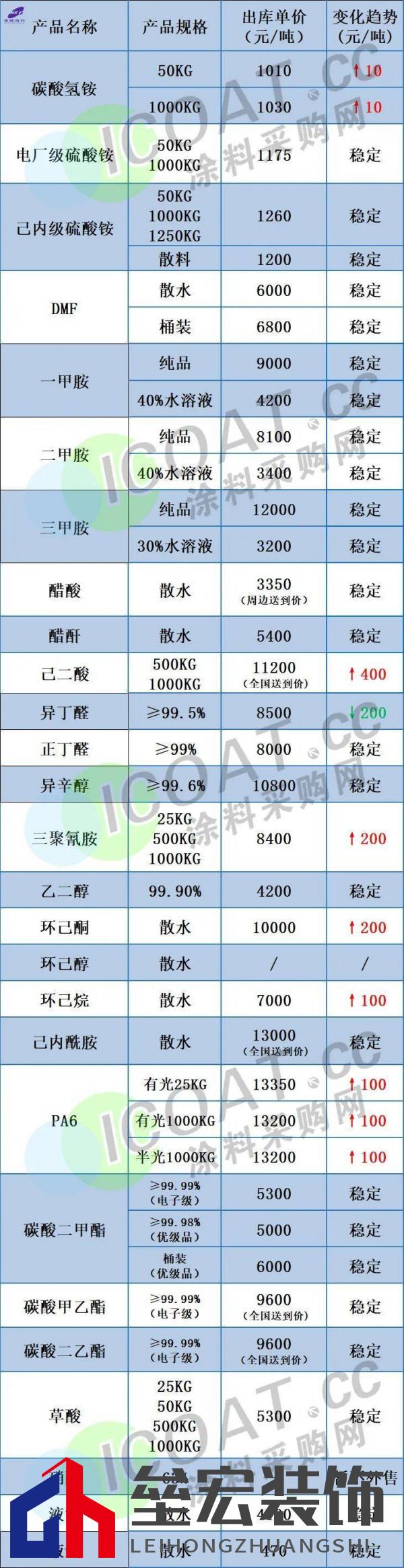 (上海華誼新材料1月29日產(chǎn)品報(bào)價(jià)表) 華魯恒升己二酸掛牌價(jià)調(diào)漲400元,報(bào)11200元/噸送到。 石家莊柏坡正元液氨調(diào)漲30元,報(bào)4250元/噸。 利華益維遠(yuǎn)化學(xué)苯酚產(chǎn)品出廠價(jià)格上調(diào)100元/噸,執(zhí)行7800元/噸。 大連恒力丁二烯價(jià)格上調(diào)200元/噸至8710元/噸。 神華寧煤丁二烯價(jià)格上調(diào)300元/噸至8400元/噸。 山東地區(qū)醋酸企業(yè)周邊送到價(jià)在3050元/噸左右,假期市場(chǎng)價(jià)格上調(diào)100元/噸。 利華益異辛醇價(jià)格上漲500元/噸,報(bào)10400元/噸。 華魯恒升異辛醇價(jià)格上漲500元/噸,報(bào)10800元/噸。 利華益維遠(yuǎn)化學(xué)丙酮產(chǎn)品出廠價(jià)格上調(diào)200元/噸執(zhí)行5200元/噸。 上海巴斯夫TDI 1月結(jié)算價(jià)19300元/噸,2月掛牌25000元/噸,環(huán)比上調(diào)4000/噸。 可樂(lè)麗株式會(huì)社發(fā)布調(diào)價(jià)通知,自2023年2月1日起,填料強(qiáng)化品種和玻璃纖維強(qiáng)化鹵素阻燃品種國(guó)內(nèi)漲60日元/kg,國(guó)外市場(chǎng)漲0.5美元/kg(約合人民幣3392元/噸);玻璃纖維強(qiáng)化鹵素阻燃品種國(guó)內(nèi)漲150日元/kg,國(guó)外市場(chǎng)漲1.2美元/kg(約合人民幣8184元/噸);LED品種國(guó)內(nèi)漲300日元/kg,國(guó)外市場(chǎng)漲2.3美元/kg(約合人民幣15604元/噸)。  信息來(lái)源:涂料采購(gòu)網(wǎng) 封面圖:立邦官網(wǎng) |