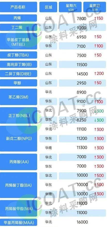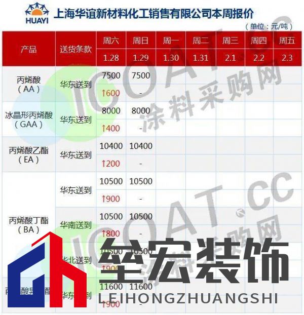 (萬(wàn)華化學(xué)1月29日產(chǎn)品報(bào)價(jià)表) 上海華誼新材料價(jià)格表顯示,與年初價(jià)格相比,丙烯酸上漲600元/噸,冰晶形丙烯酸上漲400元/噸,丙烯酸乙酯上漲200元/噸,丙烯酸丁酯上漲900元/噸,丙烯酸異丁酯上漲900元/噸。