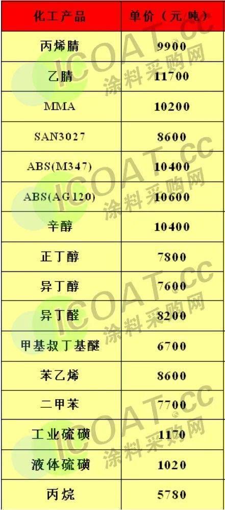 | 據(jù)涂料采購(gòu)網(wǎng)了解,乳液產(chǎn)業(yè)鏈上的甲苯、二甲苯、丙二醇、乙二醇二醚、苯乙烯等均出現(xiàn)價(jià)格上漲的情況,最高上漲超過(guò)10%;樹(shù)脂產(chǎn)業(yè)鏈上的液體環(huán)氧樹(shù)脂、新戊二醇均有上漲,雙酚A也在近幾日以噸價(jià)上漲百元的速度迎頭趕上;鈦白粉行業(yè)已有龍頭企業(yè)報(bào)價(jià)上調(diào),廠家當(dāng)前仍處于檢修中,行業(yè)供應(yīng)小幅收緊。2023年,在原材料價(jià)格上漲的趨勢(shì)之下,涂料企業(yè)的發(fā)展重點(diǎn)將會(huì)放在降本增效方面。具體原材料情況整合如下: 近日,萬(wàn)華化學(xué)發(fā)布公告,自2023年2月份開(kāi)始,公司中國(guó)地區(qū)聚合MDI掛牌價(jià)17800元/噸 (比1月份價(jià)格上調(diào)1000元/噸); 純MDI掛牌價(jià)22500元/噸 (比1月份價(jià)格上調(diào)2000元/噸)。  而在此前, 巴斯夫宣布對(duì)東盟和南亞地區(qū)的MDI基礎(chǔ)產(chǎn)品進(jìn)行漲價(jià), 漲價(jià)幅度為300美元/噸(約合人民幣2026元/噸),即日起生效,這也揭開(kāi)了近期MDI產(chǎn)業(yè)的上漲序幕。  據(jù)公開(kāi)數(shù)據(jù),印度地區(qū)目前已有MDI廠家對(duì)聚合MDI報(bào)盤(pán)上調(diào)至1850美元/噸,相較于中國(guó)農(nóng)歷新年前的1700美元/噸上漲150美元/噸。 萬(wàn)華、利華益、華魯恒升等龍頭領(lǐng)漲,40多種化工品價(jià)格調(diào)漲! 春節(jié)之后剛剛開(kāi)工,化工產(chǎn)業(yè)也在一片呼聲中開(kāi)始拉漲,40多種化工品價(jià)格上漲。 丁二烯目前報(bào)價(jià)8845元/噸,較月初報(bào)價(jià)上漲1603.75元/噸,漲幅22.15%; 異丁醛目前報(bào)價(jià)7933.33元/噸,較月初報(bào)價(jià)上漲1366.66元/噸,漲幅20.81%; 丙烷目前報(bào)價(jià)6137.5元/噸,較月初報(bào)價(jià)上漲1055元/噸,漲幅20.76%; MIBK目前報(bào)價(jià)17733.33元/噸,較月初報(bào)價(jià)上漲2966.66元/噸,漲幅20.09%; 1,4-丁二醇目前報(bào)價(jià)11290元/噸,較月初報(bào)價(jià)上漲1510元/噸,漲幅15.44%; 甲苯目前報(bào)價(jià)6590元/噸,較月初報(bào)價(jià)上漲670元/噸,漲幅11.32%; 己內(nèi)酰胺目前報(bào)價(jià)11966.67元/噸,較月初報(bào)價(jià)上漲900元/噸,漲幅8.13%; 加氫苯目前報(bào)價(jià)7100元/噸,較月初報(bào)價(jià)上漲533.33元/噸,漲幅8.12%; 純苯目前報(bào)價(jià)7015.5元/噸,較月初報(bào)價(jià)上漲483.33元/噸,漲幅7.40%; PX目前報(bào)價(jià)8000元/噸,較月初報(bào)價(jià)上漲550元/噸,漲幅7.38%; 二甲苯(溶劑級(jí))目前報(bào)價(jià)7375元/噸,較月初報(bào)價(jià)上漲500元/噸,漲幅7.27%; 苯乙烯目前報(bào)價(jià)8516.67元/噸,較月初報(bào)價(jià)上漲516.67元/噸,漲幅6.46%; 丙二醇目前報(bào)價(jià)7866.67元/噸,較月初報(bào)價(jià)上漲466.67元/噸,漲幅6.31%; 三氯甲烷目前報(bào)價(jià)2400元/噸,較月初報(bào)價(jià)上漲137.5元/噸,漲幅6.08%; 環(huán)己酮目前報(bào)價(jià)9690元/噸,較月初報(bào)價(jià)上漲470元/噸,漲幅5.10%; 碳酸二甲酯目前報(bào)價(jià)4900元/噸,較月初報(bào)價(jià)上漲233.33元/噸,漲幅5.00%。 2023年1月部分化工品漲價(jià)榜 (單位:元/噸)  (以上數(shù)據(jù)來(lái)源于涂料采購(gòu)網(wǎng)信息中心,如有差池請(qǐng)以實(shí)際數(shù)據(jù)為準(zhǔn)!) 除此之外,多家龍頭化工企業(yè)的報(bào)價(jià)單顯示,目前的單噸報(bào)價(jià)已經(jīng)比年初上漲了近千元。部分在1月價(jià)格維穩(wěn)甚至下滑的化工品也在月末出現(xiàn)了上漲的苗頭,似乎要抓住開(kāi)工的利好時(shí)機(jī),達(dá)成逆勢(shì)翻身的目的。 利華益集團(tuán)報(bào)價(jià)表顯示,與年初價(jià)格相比,丙烯腈上漲400元/噸,MMA上漲100元/噸,辛醇上漲900元/噸,異丁醇上漲200元/噸,異丁醛上漲200元/噸,甲基叔丁基醚上漲100元/噸,苯乙烯上漲500元/噸,丙烷上漲780元/噸。