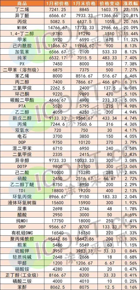 (華魯恒升1月29日產(chǎn)品報(bào)價(jià)表) 萬(wàn)華化學(xué)報(bào)價(jià)表顯示,與年初價(jià)格相比,丙烯上漲400元/噸,丁二烯上漲1400元/噸,MTBE上漲300元/噸,叔丁醇上漲200元/噸,二異丁烯上漲300元/噸,苯乙烯上漲500元/噸,新戊二醇上漲1000元/噸,丙烯酸上漲300元/噸,丙烯酸丁酯上漲1000元/噸。