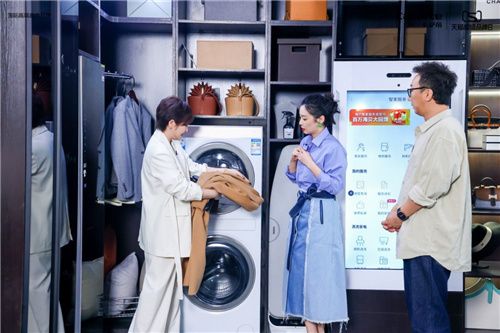 體驗(yàn)完新一代廚房,丁丁張?zhí)岢龈叨嗣媪想y以護(hù)理的問(wèn)題,而方齡現(xiàn)場(chǎng)為她們推薦了卡薩帝洗衣機(jī)。三人走進(jìn)衣帽間,高葉將一件羊毛面料的衣物放進(jìn)洗衣機(jī)后,通過(guò)“養(yǎng)護(hù)空氣洗”的護(hù)理很快恢復(fù)了柔順質(zhì)感和最初色彩?!氨话怖搅耍@個(gè)功能不錯(cuò),還不用水洗!”對(duì)于經(jīng)常換裝、出席活動(dòng)的高葉來(lái)說(shuō),高端面料衣物多、換衣勤,而卡薩帝洗衣機(jī)能讓她輕松擁有精致生活。 來(lái)到智慧客廳,三人坐在沙發(fā)上暢聊女性話題,體驗(yàn)居家時(shí)光的愜意和舒適。在冰吧中取出水果、飲品,一句話喚醒空調(diào),可以體驗(yàn)到適合每個(gè)人的專屬空氣,同時(shí)享受一場(chǎng)影院級(jí)音畫效果的電影。隨后在插花、泡茶的間隙,高葉還分享了她日常起居時(shí)的放松方式,泡澡時(shí)放音樂(lè),配合香薰精油按摩……這些方式不但有效改善睡眠,更讓她舒適享受完美的一天。而卡薩帝熱水器、烘干機(jī)等卡薩帝家電都能幫助她們及時(shí)發(fā)現(xiàn)藏在生活里的美。