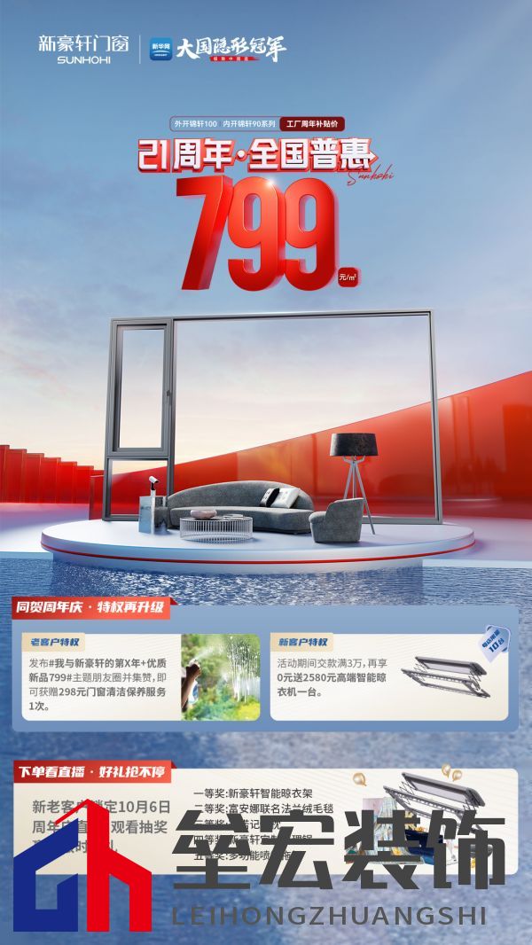 新豪軒21周年慶期間 不僅有799元鉅惠好窗亮相 更有新老客戶專屬福利放送 歡迎前往新豪軒門店咨詢 并鎖定10月6日周年慶直播 下單搶好窗 抽獎贏大禮
