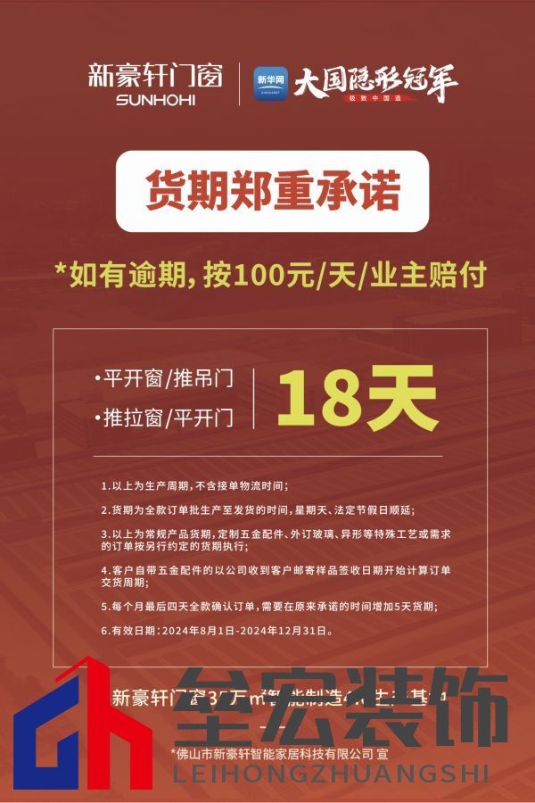 03.智造讓實惠 質效雙保障 品質好窗為何只賣799元?低價產品是否會有好物?不要擔心,新豪軒為你揭曉好窗的鉅惠密碼。 不同于“低價低配”路線,新豪軒開啟“智造讓利”模式。新豪軒背靠亞洲航母級門窗生產基地,采用數(shù)智化軟硬件設備 + 精益化高效管理模式,從根本上實現(xiàn)降本增效,形成良性生產循環(huán),從而持續(xù)性地讓利消費者。 在降價不降配同時,新豪軒還用“兩大首發(fā)”消費者提供質效雙保障:獨家首發(fā)的《質量承諾書》圍繞產品用材、性能參數(shù)、質保服務等消費者關心的問題作出明確承諾,讓工藝選材透明化、消費保障書面化;行業(yè)首發(fā)的《貨期承諾書》列明系統(tǒng)窗生產周期僅需18天,大大提高了整體交付效率,讓消費者更快用上好門窗。