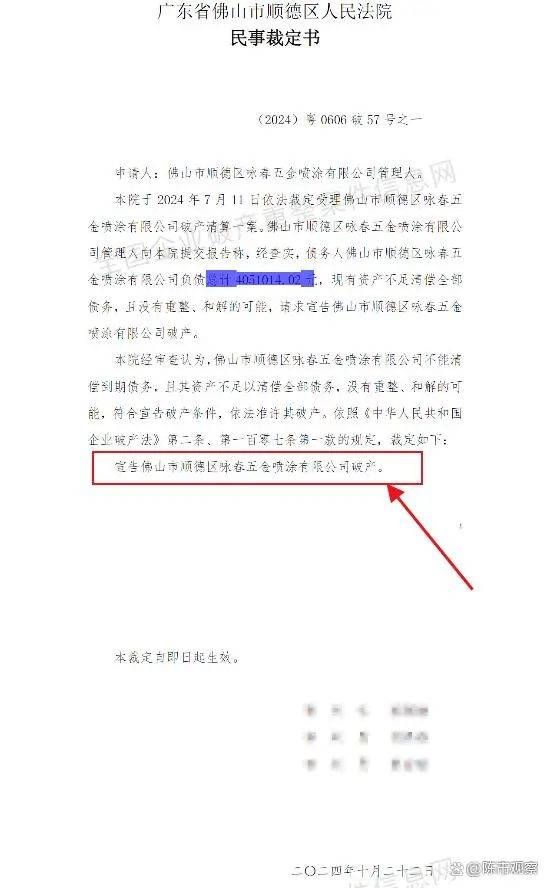 | 據(jù)消息顯示,佛山市順德區(qū)人民法院日前發(fā)布公告,以旗下資產(chǎn)無法覆蓋全部債務、且明顯不具備償債能力為由,裁定宣告佛山市順德區(qū)詠春五金噴涂有限公司(下稱“詠春五金”)破產(chǎn)。2024年7月11日,法院依法受理了關于“詠春五金”的破產(chǎn)申請,并指定了資產(chǎn)管理人。經(jīng)資產(chǎn)管理人核定,詠春五金已確認的負債額總計為4051014.02元人民幣,但其旗下資產(chǎn)已不足以償還全部債務,且不具備償債能力、亦無和解之可能,符合破產(chǎn)條件。根據(jù)相關法律規(guī)定,佛山市順德區(qū)人民法院于2024年10月24日裁定宣告詠春五金破產(chǎn)。  自此,這家運作了17年的五金工廠徹底成為歷史,一批產(chǎn)業(yè)工人因此而失業(yè),著實令人唏噓。讓人想不到的是,一家注冊資金本僅有5萬元的五金企業(yè),最終負債竟高達400多萬,而隨著詠春五金的破產(chǎn),這筆債務可能再無化解的可能了。 公開資料顯示,詠春五金于2007年注冊成立,距今已有17年時間。詠春五金的主營業(yè)務為生產(chǎn)制造五金制品、電器零配件等產(chǎn)品的。雖然詠春五金的規(guī)模并不大,但其能連續(xù)運營17年,足以說明其產(chǎn)品得到了市場的驗證和認可。  然而,隨著內(nèi)外形勢的快速轉變,這家運作17年的五金工廠最終走到破產(chǎn)的地步。在其破產(chǎn)之前,詠春五金已被列入“經(jīng)營異?!薄ⅰ笆疟粓?zhí)行人”名錄,處境之艱難由此可見一斑。 在業(yè)內(nèi)人士看來,由于受到下游需求持續(xù)萎縮等因素的影響,五金類制造業(yè)正面臨全方位挑戰(zhàn),曾經(jīng)“訂單接到手軟”的場景也一去而不復返,多數(shù)企業(yè)因訂單急速減少而陷入困難,減產(chǎn)、關停等情況屢見不鮮。在這個大背景下,一些大型五金制造企業(yè)憑借技術實力、資金充裕、市場和產(chǎn)品線多元化等優(yōu)勢,尚且可以保住市場份額,而中小微企業(yè)則處于苦苦支撐狀態(tài),稍有不慎將難以為繼。  此外,由于詠春五金的管理者缺乏對市場形勢的客觀判斷,導致其陷入盲目擴張的陷阱,進而導致其資金鏈完全斷裂,經(jīng)營難以為繼,負債400多萬則是詠春五金盲目擴張最好的證明,而資不抵債是詠春五金盲目擴張后所必然需要承擔的后果。  總的來看,詠春五金的破產(chǎn)已成為既定事實,難以改變。對于詠春五金的債權人來說,如何最大程度挽回損失,或成了最重要的問題。 來源:陳市觀察返回搜狐焦點首頁,查看更多 |