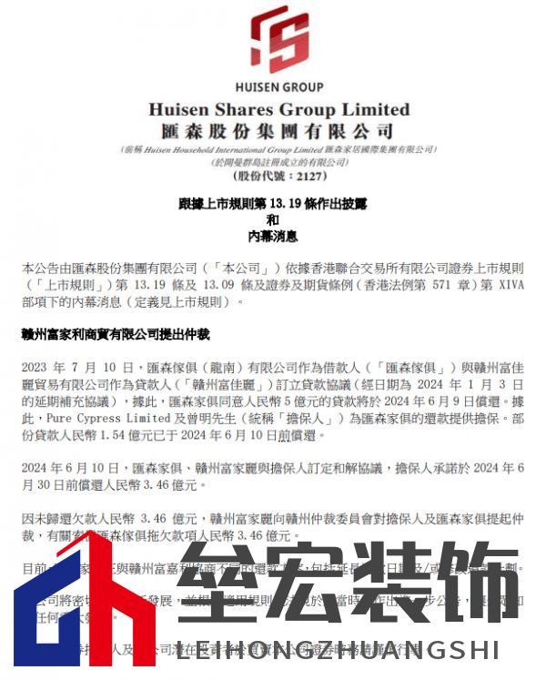 | 匯森股份2月6日公告,因未如期歸還欠款3.46億元,公司已被債權(quán)人申請仲裁。  根據(jù)公告,2023年7月10日,匯森家具(龍南)有限公司作為借款人(「匯森家具」)與贛州富佳麗貿(mào)易有限公司作為貸款人(「贛州富佳麗」)訂立貸款協(xié)議(經(jīng)日期為2024年1月3日的延期補(bǔ)充協(xié)議),據(jù)此,匯森家俱同意人民幣5億元的貸款將于2024年6月9日償還。據(jù)此,Pure Cypress Limited及曾明先生(統(tǒng)稱「擔(dān)保人」)為匯森家俱的還款提供擔(dān)保。部份貸款人民幣1.54億元已于2024年6月10日前償還。 2024年6月10日,匯森家俱、贛州富家麗與擔(dān)保人訂定和解協(xié)議,擔(dān)保人承諾于2024年6月30日前償還人民幣3.46億元。 因未歸還欠款人民幣3.46億元,贛州富家麗向贛州仲裁委員會(huì)對(duì)擔(dān)保人及匯森家俱提起仲裁,有關(guān)索償匯森家具拖欠款項(xiàng)人民幣3.46億元。 目前,匯森家俱正與贛州富嘉利協(xié)商不同的還款方案,包括延長還款日期及/或修改還款計(jì)劃。匯森家俱稱,公司將密切監(jiān)察最新發(fā)展,并根據(jù)適用規(guī)則及法規(guī)于適當(dāng)時(shí)候作出進(jìn)一步公告,讓公眾知悉任何重大發(fā)展。 來源:77度 |