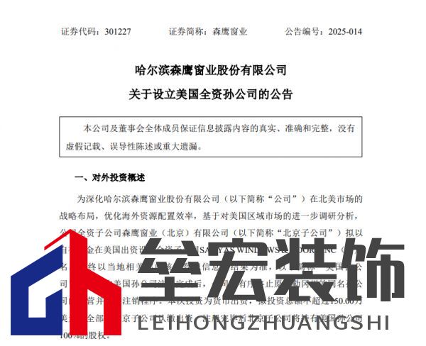 2月25日,森鷹窗業(yè)(301227.SZ)發(fā)布公告稱,為深化公司在北美市場的戰(zhàn)略布局,優(yōu)化海外資源配置效率,基于對美國區(qū)域市場的進一步調(diào)研分析,公司全資子公司森鷹窗業(yè)(北京)有限公司(簡稱“北京子公司”)擬以自有資金在美國出資設(shè)立全資子公司SAYYAS WINDOWS & DOORS INC(暫定名,最終以當?shù)叵嚓P(guān)部門核準登記信息的結(jié)果為準,簡稱“美國孫公司”)。