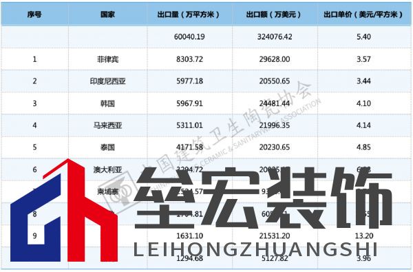 ??京東MALL四川首店即將試營(yíng)業(yè) ??營(yíng)業(yè)面積近4萬平方米的京東MALL四川首店落戶成都高新區(qū),將于3月15日開啟試營(yíng)業(yè),并同期舉辦春季家博薈活動(dòng)。據(jù)介紹,京東MALL成都店作為京東自營(yíng)商業(yè)體,經(jīng)營(yíng)200多個(gè)一線品牌,20多萬種商品。全渠道經(jīng)營(yíng)家電、手機(jī)、電腦、數(shù)碼、清潔電器、生活電器、建材衛(wèi)浴、家具家居等品類,融入電競(jìng)游戲、咖啡冰酒、美食烘焙、美妝個(gè)護(hù)、家場(chǎng)景、兒童樂園等體驗(yàn)業(yè)態(tài)。 ??2024年泰國(guó)陶衛(wèi)行業(yè)整體收入69億元 ??2024年,消費(fèi)需求疲軟與成本壓力成為泰國(guó)陶衛(wèi)行業(yè)共性挑戰(zhàn)。2024年,泰國(guó)墻地磚和銷售額皆有所下滑,整體收入325億泰銖(合人民幣69.8億元)。2024年,墻地磚產(chǎn)量為107030712.64平方米,總銷售為225億泰銖(合人民幣48億元);衛(wèi)生陶瓷銷量為5058169件,總銷售額99億泰銖(合人民幣21億元),其中馬桶銷量2863070件,銷售額75億泰銖(合人民幣16.1億元);小便斗銷售188194件,銷售額3.6億泰銖(合人民幣7813萬元);面盆銷售1905354件,銷售20億泰銖(合人民幣4.3億元)。 ??4家陶企向40家裝企提起訴訟 ??據(jù)業(yè)內(nèi)媒體不完全統(tǒng)計(jì),2024年以來,全國(guó)共有125家裝飾裝修公司宣告破產(chǎn)。與此同時(shí),受整裝、家裝渠道的影響,陶瓷企業(yè)與裝修公司的糾紛也在不斷上升。以4家陶瓷企業(yè)的訴訟情況為例,2024年以來,合計(jì)與40家裝修公司提起訴訟,均為買賣合同糾紛影響。 ??2024年我國(guó)陶瓷磚出口額暴跌33.26% ,創(chuàng)八年新低 ??據(jù)中國(guó)建筑衛(wèi)生陶瓷協(xié)會(huì)發(fā)布的數(shù)據(jù)顯示,2024年,我國(guó)陶瓷磚出口量維持在6.00億平方米,同比下降2.86%,出口單價(jià)同比下跌31.30%至5.40美元/平方米,導(dǎo)致出口額從48.56億美元降至32.41億美元,同比降幅達(dá)33.26%,為近八年新低。2024年,中國(guó)陶瓷磚出口前十大目的地國(guó)家/地區(qū)的出口總量為4.02億平方米,占總出口量的66.92%。2024年,廣東、福建、山東、遼寧、廣西為我國(guó)陶瓷磚出口前五大省份,合計(jì)出口量占比達(dá)91.93%,與2023年(92.51%)基本持平。與2023年相比,浙江跌出前五,廣西上升至第5位。