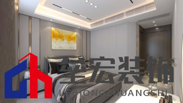 ??主臥室床頭為墻板背景墻,鈦金條點(diǎn)綴,莊重典雅,頂面為無(wú)主燈懸浮吊頂,既可以滿(mǎn)足中央空調(diào)的安裝,中間也不顯空曠。