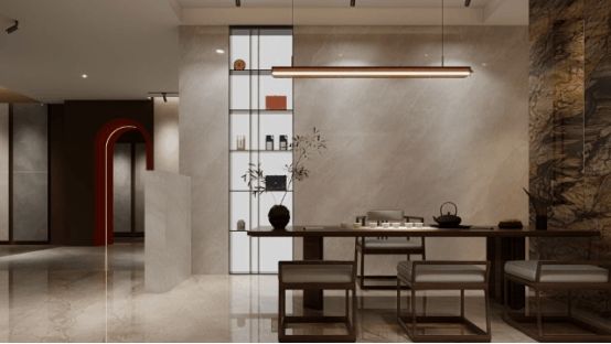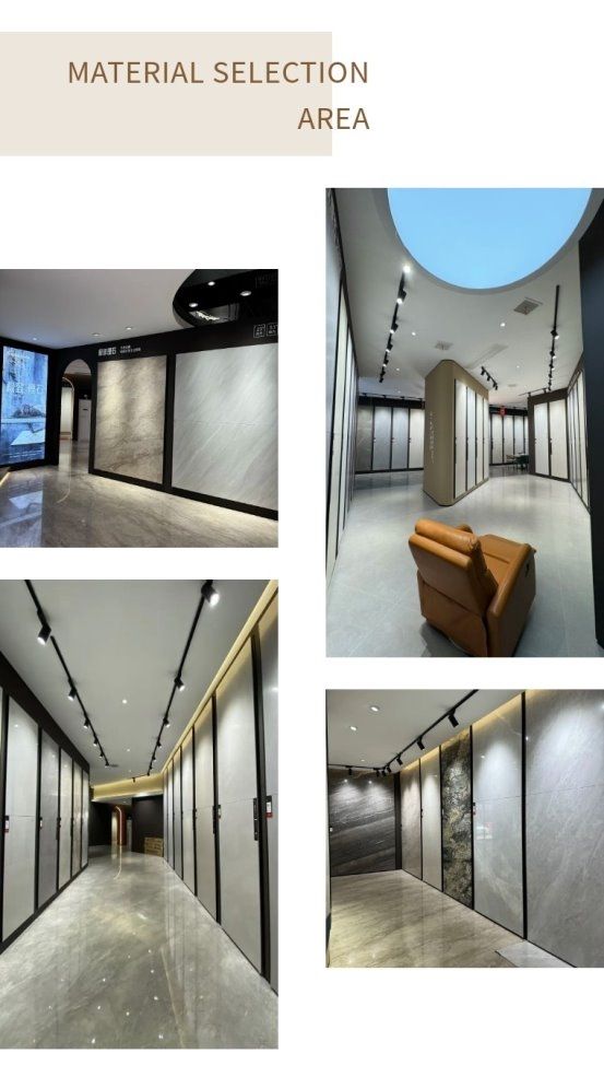 空間賞析 SPACE TO ENJOY 設(shè)計師團隊深度洞察流行趨勢,將最具市場前瞻性的大紋理產(chǎn)品陳列呈現(xiàn)于展廳核心展區(qū),通過專業(yè)燈光設(shè)計與場景化鋪貼,讓每處紋理都成為空間的視覺焦點。