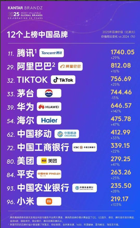 | ??5月15日,2025年凱度BrandZ最具價(jià)值全球品牌100強(qiáng)榜單正式揭曉,品牌總價(jià)值達(dá)到10.7萬億美元,同比增長29%,彰顯全球頂端品牌的韌性。蘋果作為榜單中唯一的萬億美元級(jí)品牌,連續(xù)四年蟬聯(lián)榜首,騰訊、華為、海爾等12個(gè)中國品牌躋身百強(qiáng)陣營。其中,海爾連續(xù)7年蟬聯(lián)全球唯一物聯(lián)網(wǎng)生態(tài)品牌,全球排名從最初的第89名逐步上升至第54名,品牌價(jià)值同比增長47%,再創(chuàng)新高。
