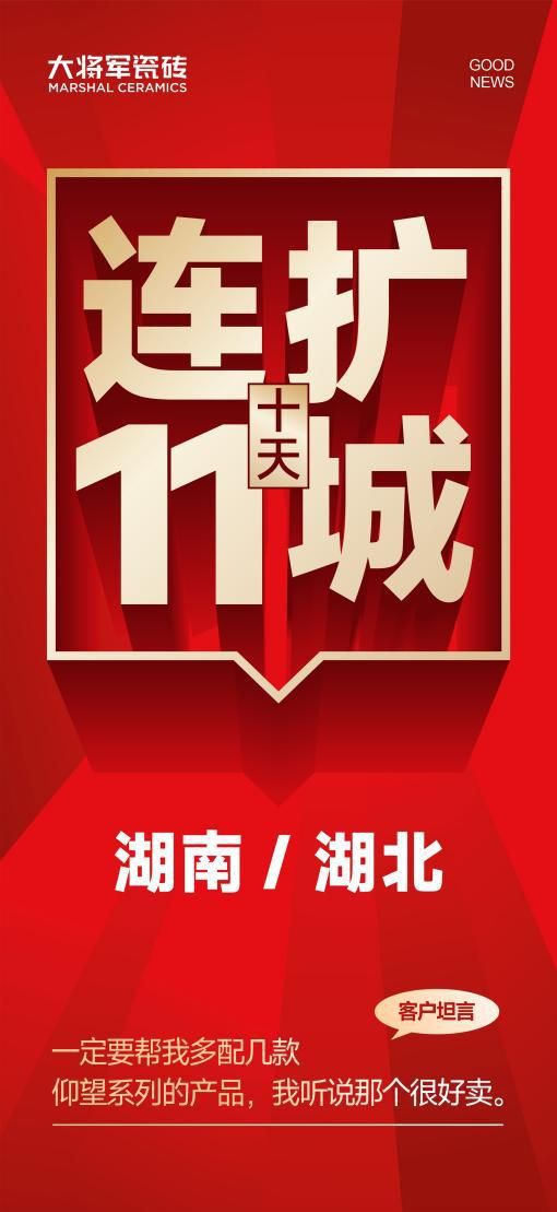 | 在瓷磚行業(yè)廝殺激烈的戰(zhàn)場上,品牌突圍猶如逆水行舟。大將軍瓷磚卻硬是在5月12日至22日這短短10天里,從湖南湖北市場撕開突破口,一口氣簽下11家新店。這記漂亮的"閃電戰(zhàn)",背后藏著22年老牌企業(yè)的三大實(shí)戰(zhàn)秘訣。
