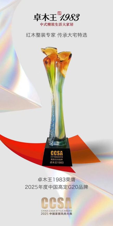 2025年7月8日,在萬眾矚目的“萬福倉之夜——致敬高定十年·第十屆CCSA家居風(fēng)尚大典暨2025高定十年G20+頒獎(jiǎng)禮”上,紅木整裝創(chuàng)lin品牌卓木王再度榮膺“高定G20品牌大獎(jiǎng)”。 作為“紅木整裝世家 傳承祖宅首選”品牌,卓木王已連續(xù)幾年蟬聯(lián)此項(xiàng)行業(yè)頂ji榮譽(yù),卓木王持續(xù)獲得行業(yè)高度認(rèn)可,穩(wěn)居中式高定標(biāo)桿地位。