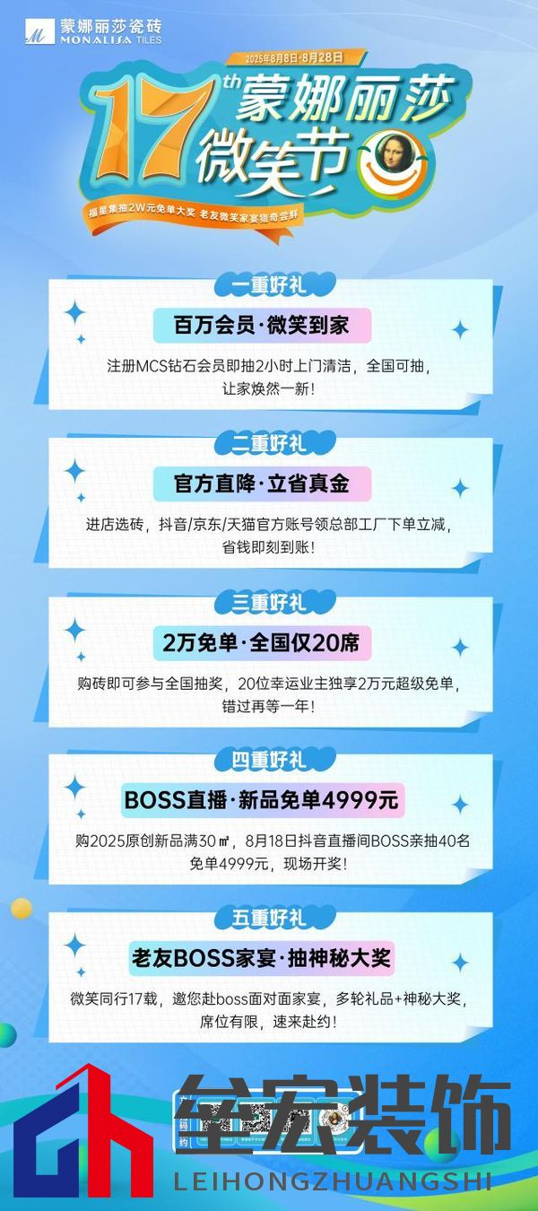 ??為真誠回饋廣大用戶的信賴,今年針對2025原創(chuàng)新品——「時空石韻」與「無極石界」的優(yōu)惠力度進行了重磅升級,凡用戶購買上述新品對應(yīng)規(guī)格瓷磚面積達30㎡及以上,即可有機會抽取4999元免單大獎,鎖定8月18日,蒙娜麗莎瓷磚抖音官方直播間將迎來神秘BOSS空降,這場專屬直播將會揭曉免單名額! 微笑力量,從品質(zhì)交付到情感聯(lián)結(jié)??承載著對”美好家“與健康生活的執(zhí)著追求,更為了回饋萬千用戶的信任與期待,蒙娜麗莎微笑節(jié)已在全國范圍200多個城市,超3000家線下門店展開,同步打通天貓、京東、抖音直播間等線上渠道,形成了全覆蓋渠道的系列主題活動。 ??今年8月8日,這場持續(xù)的溫暖承諾將再度兌現(xiàn)。第十七屆蒙娜麗莎微笑節(jié)即將盛大啟幕,其中,最令人期待的”BOSS微笑家宴“,是品牌誠意與溫度的集中體現(xiàn),用戶將獲得與老板面對面交流的機會,暢談使用蒙娜麗莎瓷磚的真實體驗與生活故事。?現(xiàn)場還將精心準備多輪禮品福利,更有機會抽取驚喜大獎,這不僅是一場傾聽用戶心聲的對話,更是一次拉近品牌與用戶距離的情感交融。