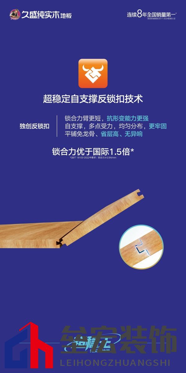 ??②超穩(wěn)定自支撐反鎖扣技術: ??獨創(chuàng)反鎖扣結構,自支撐,多點受力,力度分布更均勻,著力點向上,支撐更牢固;無需使用龍骨、打釘、施膠粘結等其它輔助材料,大規(guī)格地板也穩(wěn)定,鎖合力優(yōu)于國標1.5倍,為純實木地板平鋪戴上了“雙保險”。