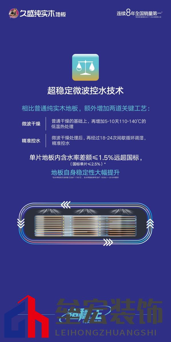 ??創(chuàng)新技術組合拳 ??①超穩(wěn)定微波控水技術: ??比普通純實木地板額外增加10天以上的“微波干燥”和“精準控水”2道關鍵工藝,地板自身穩(wěn)定性大幅提升,木材含水率更均勻,單片內差額≤1.5%遠優(yōu)國標(國標單片≤2.5%)。