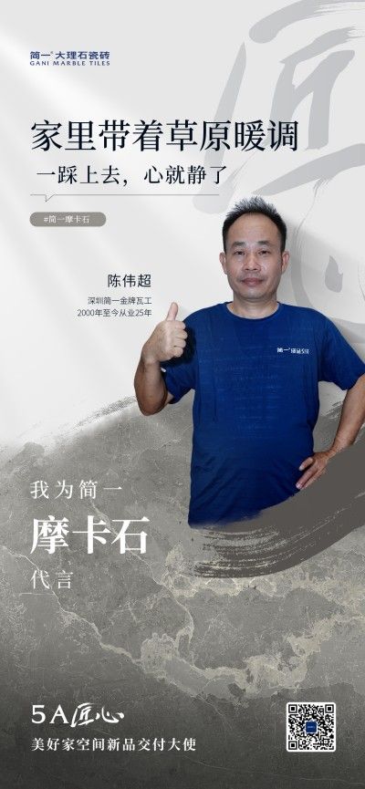 (摩卡石細啞面表面效果) ??陳偉超的二十五年,恰似他摯愛的摩卡石——不喧嘩,自有聲。他俯身校準每道切割線的專注,如同磚面上凝固的沙痕,于靜默中鋪就天地的遼闊;他讓磚縫消隱的執(zhí)念,恰似這細啞工藝的溫潤,用精工托起生活的本真。在5A空間交付的敘事里,他是讓自然住進方寸的詩人:用磚石編織草原,用縫隙丈量心安。 ??這僅是簡一5A匠心?美好家空間新品交付大使故事的又一篇章。后續(xù)將有更多匠人帶著他們守護的簡一新品走來——或許是另一種地貌的呼吸,或許是另一段光陰的凝練。不妨靜候:那些藏在磚石肌理里的天地大美,將如何重塑“家”的想象邊界。 |