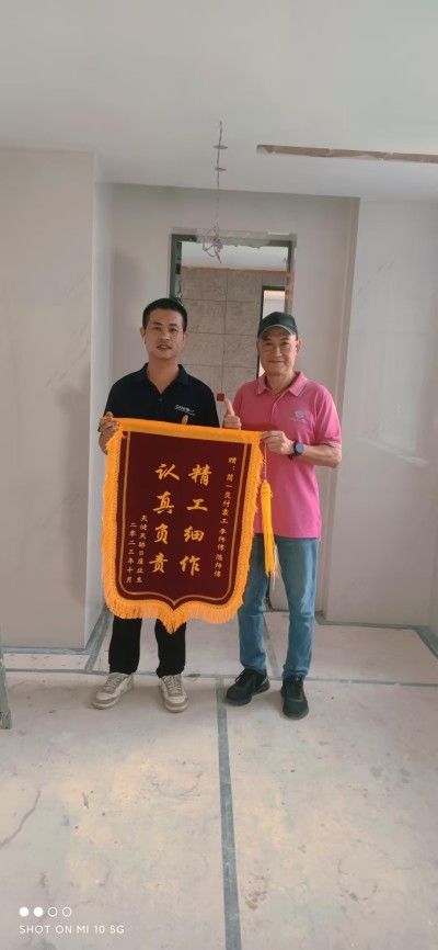 ??盛夏的工地沒有空調,汗水順著額角淌進眼睛里,他抹把臉繼續(xù)校準瓷磚,手指不停在磚邊比畫,就怕一刀下去破壞了紋路的流暢;寒冬的風裹著冷氣往骨頭里鉆,指尖凍得發(fā)僵,他就往手心哈口熱氣搓搓,再繼續(xù)貼著磚邊找角度,哪怕膝蓋抵著冰冷的地面麻了半邊腿,也得等確認切口和原磚嚴絲合縫才肯起身。 ??這些藏在寒暑里的堅持,讓他通過手里的磚片,把“切磚如原磚”的細致,刻進了深圳深鐵懿府、臨海攬山、香蜜湖熙園這些深圳高端住宅的角落里。而這樣的細致,陪著他鋪妥了300多個家的瓷磚,從未打折扣。 ??簡一5A空間交付:只為那份妥帖和心安 ??有人問他:“干這么多年,哪一刻最有成就感?”陳偉超笑了:“前陣子在香蜜湖別墅,業(yè)主看完非常滿意,當場說‘這項目的其他地方也給你們做’?!?/p> ??這份信任,源于他對工藝精度的執(zhí)著打磨,簡一今年全新升級「5A精工薄貼」工藝后,他貼的磚縫能控制在0.2毫米以內——比半根頭發(fā)絲還細,站在遠處看,墻/地面像一整塊渾然天成的石材,紋理順著墻/地面自然延伸,業(yè)主驗收時湊近了才發(fā)現“原來有縫”。 ??這一面面由業(yè)主親手送上的錦旗,便是對陳偉超匠心最生動的認證:深圳星河丹堤李小姐送來的“手藝精湛 完美呈現 服務周到 盡心盡責”,16個金光大字里,仿佛能看見他為調順一道紋理,蹲在地上半天不動直到腿麻的執(zhí)著,也能想起他一次次停下手中活計,耐心解答業(yè)主疑問時眼里的真誠;